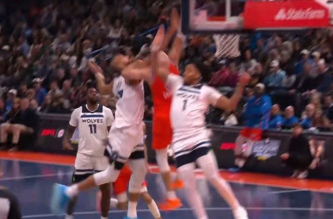 戈贝尔击中哈尔滕施泰因面部吃T,森林狼挑战成功改吹哈尔滕施泰因犯规,但戈贝尔技术犯规保留。